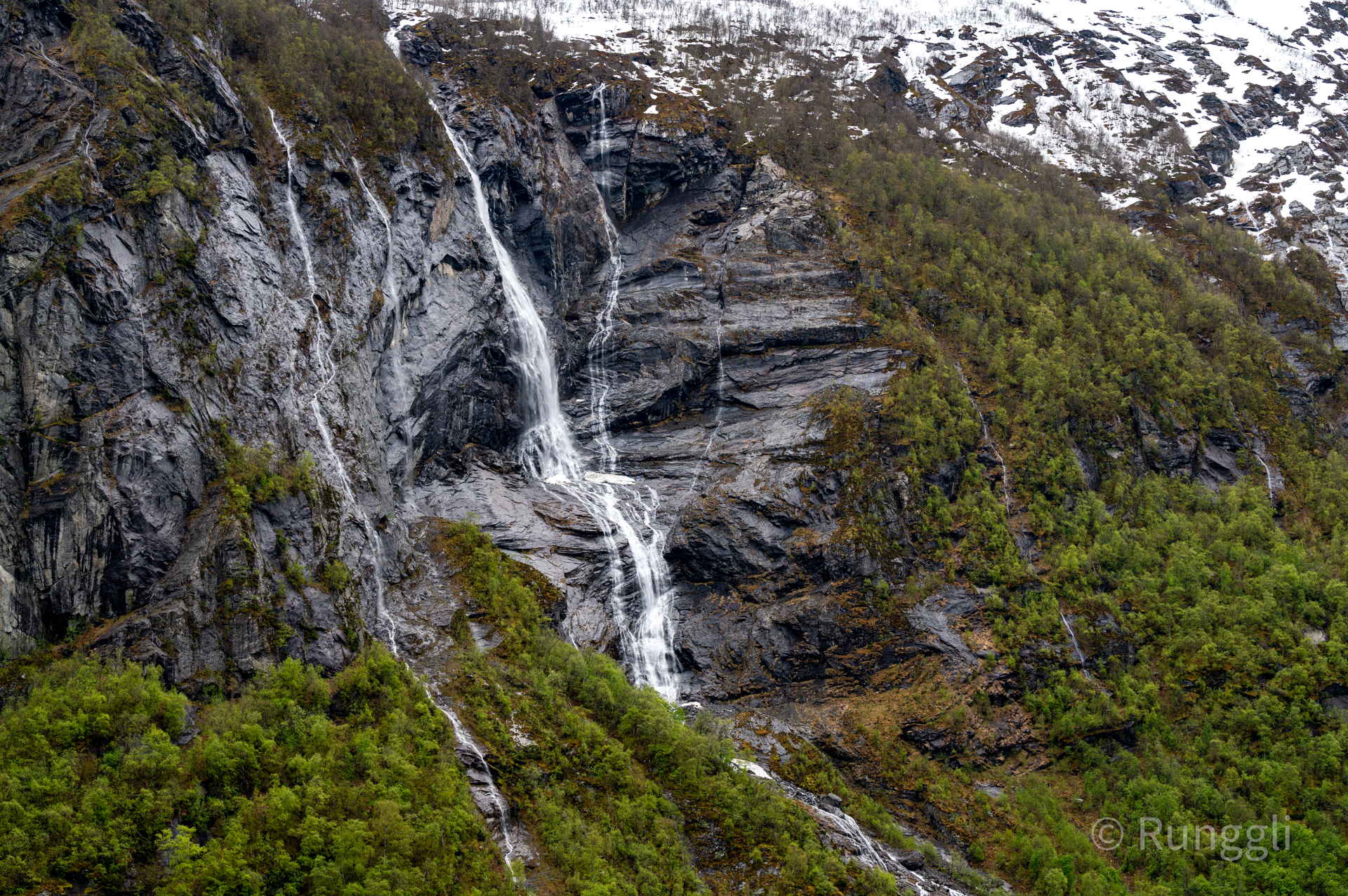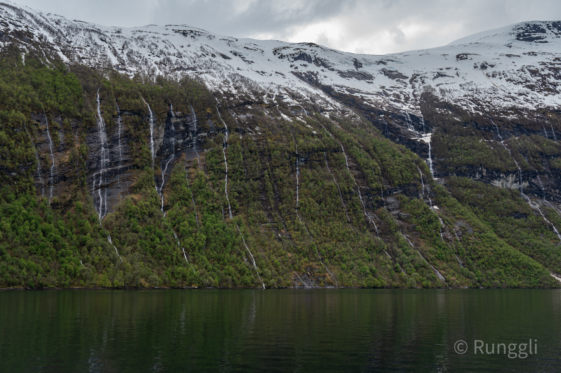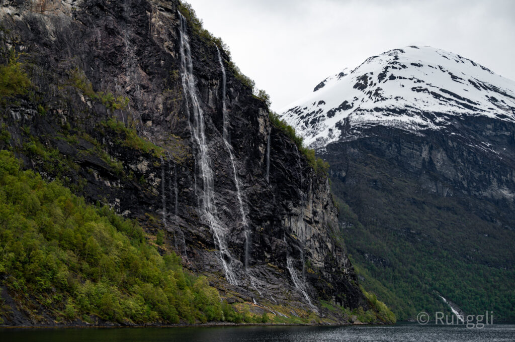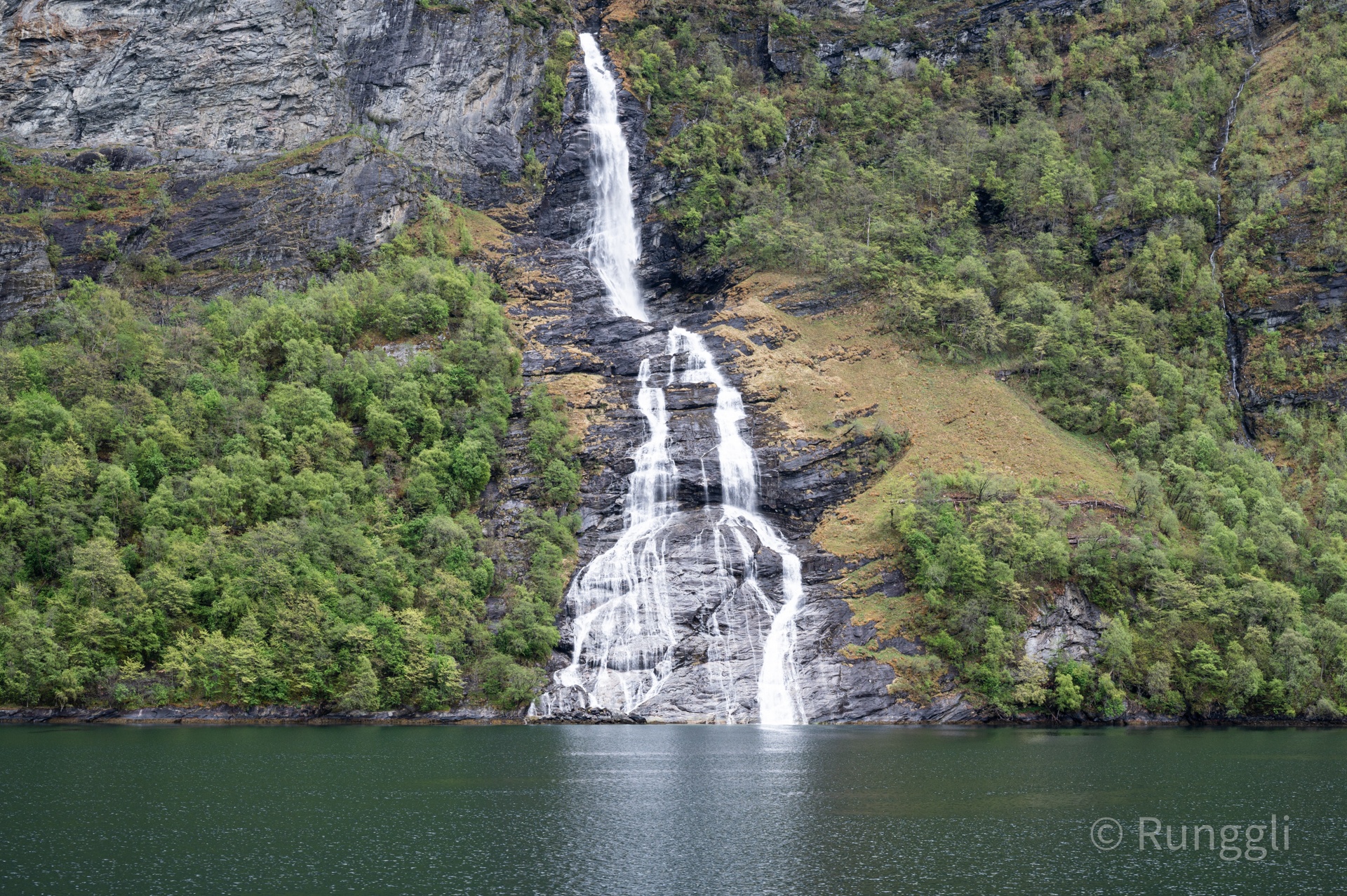 Die Felswände die den Geirangerfjord säumen sind bis zu 600 Meter hoch. Kein Wunder also stürzen einige imposante Wasserfälle in die Tiefe. Der bekannteste unter ihnen ist wohl De syv søstrene – zu Deutsch „die sieben Schwestern“. Die grösste der „Schwestern“ weist dabei eine Fallhöhe von 300 Metern auf.